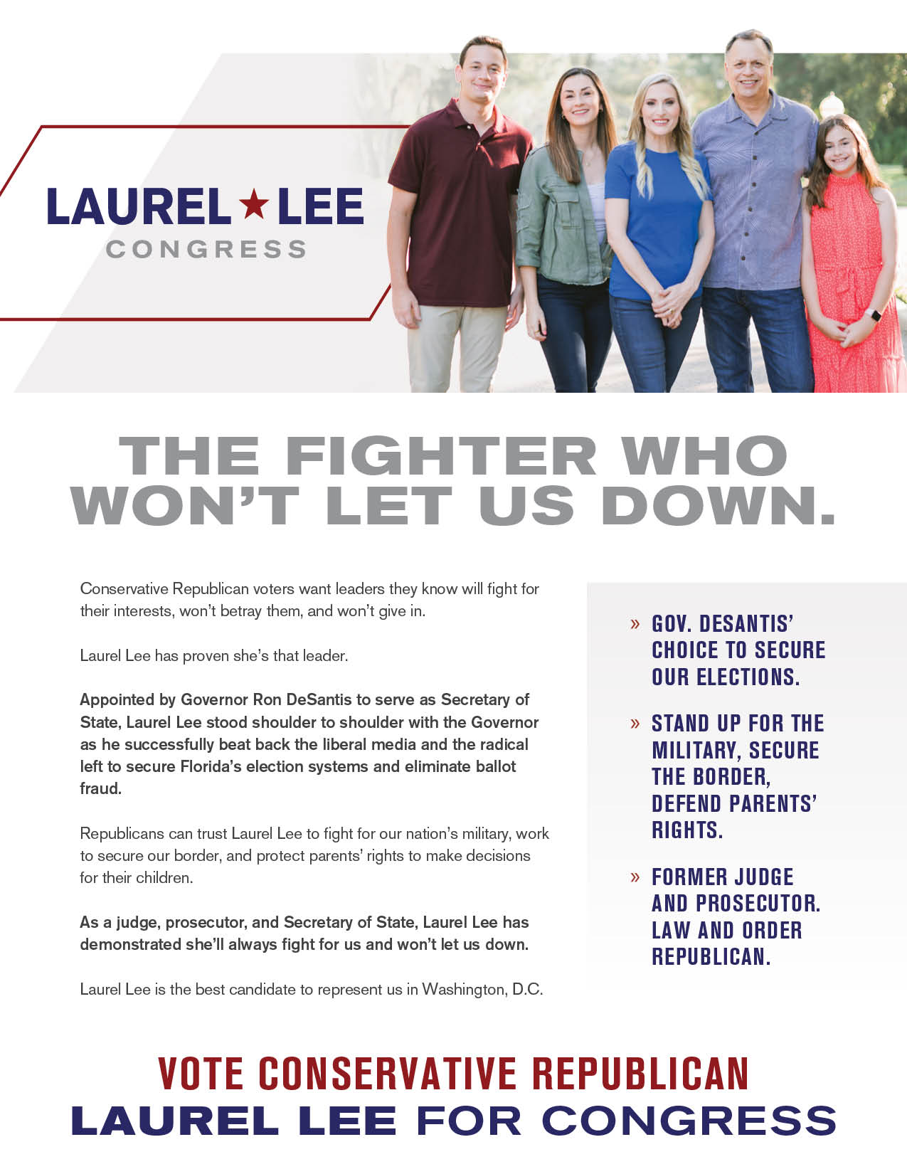 Laurel Lee was elected in 2022 to serve Florida's 15th District, she is actively working in Washington to stop Biden's reckless border policies, defend our family values, and grow our economy.