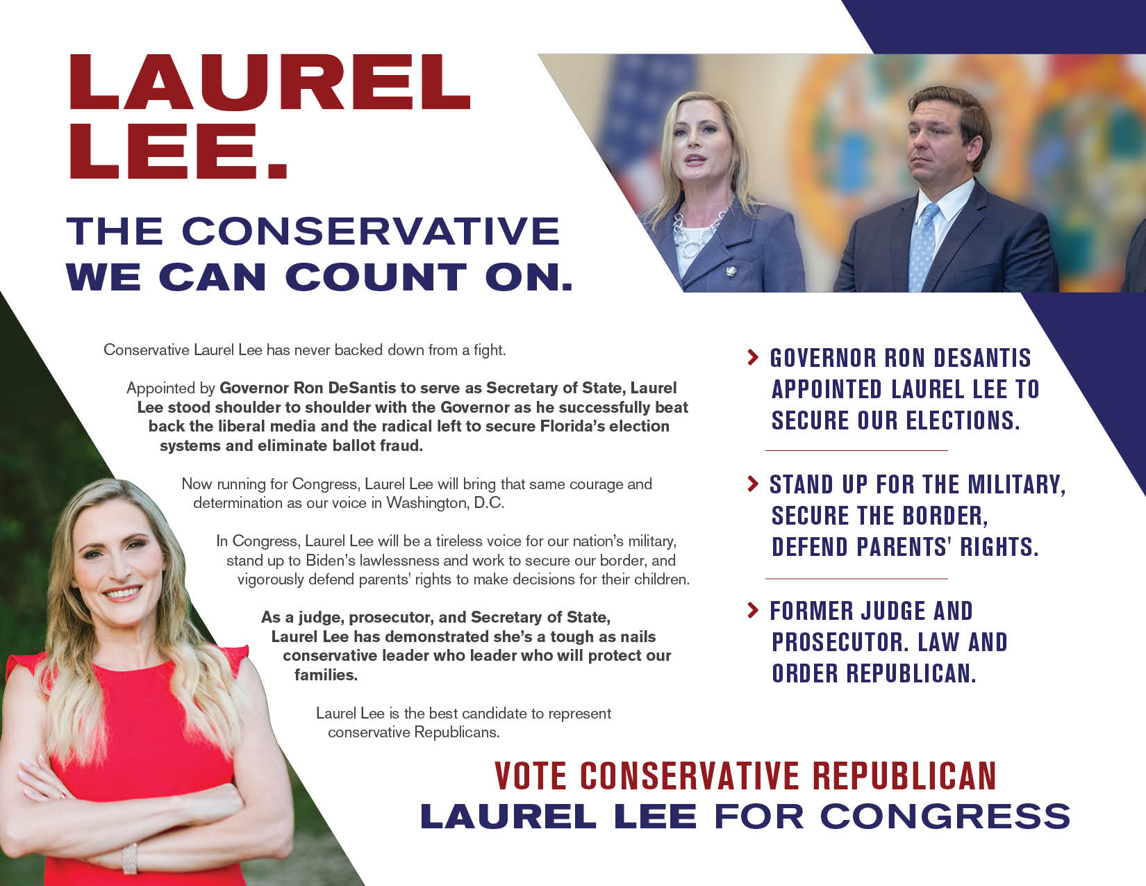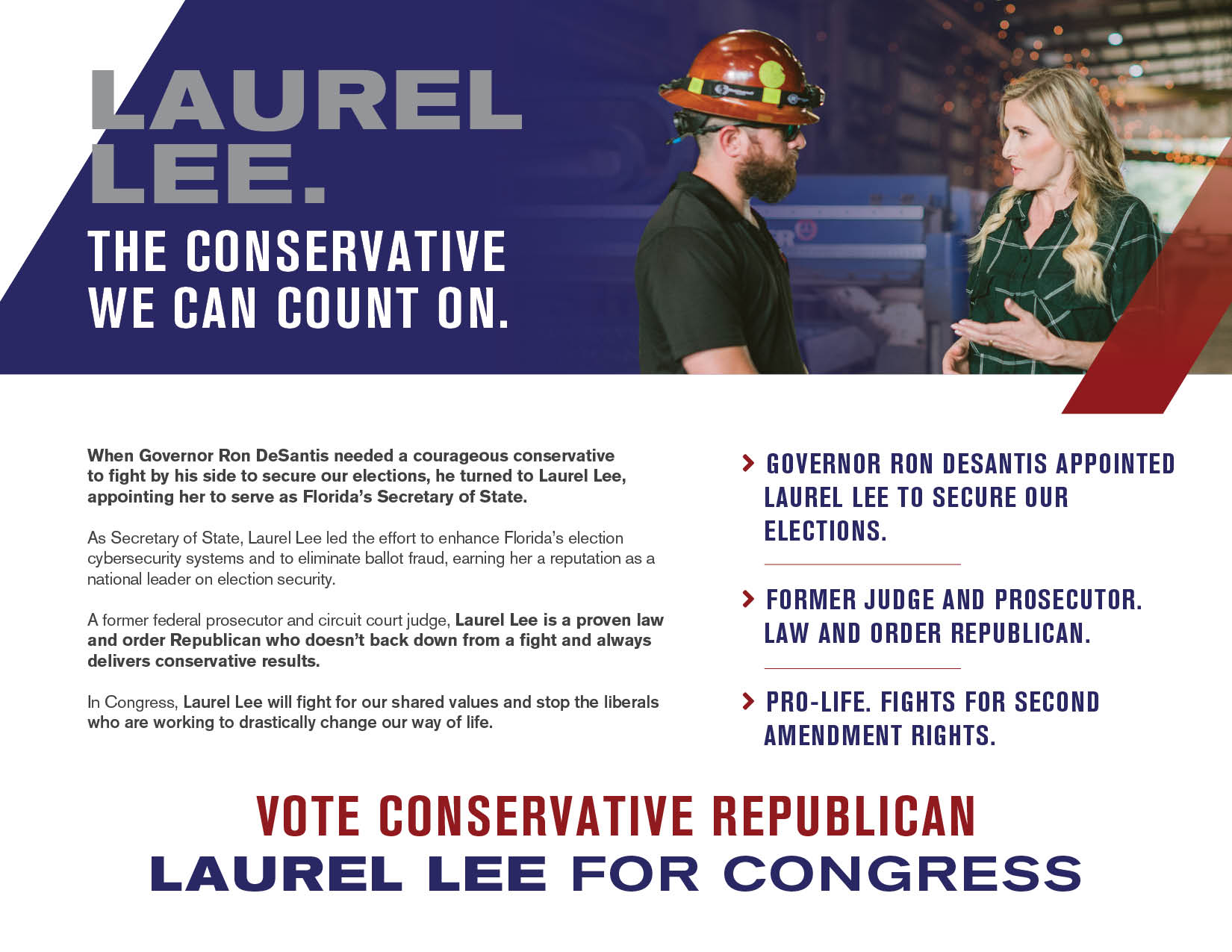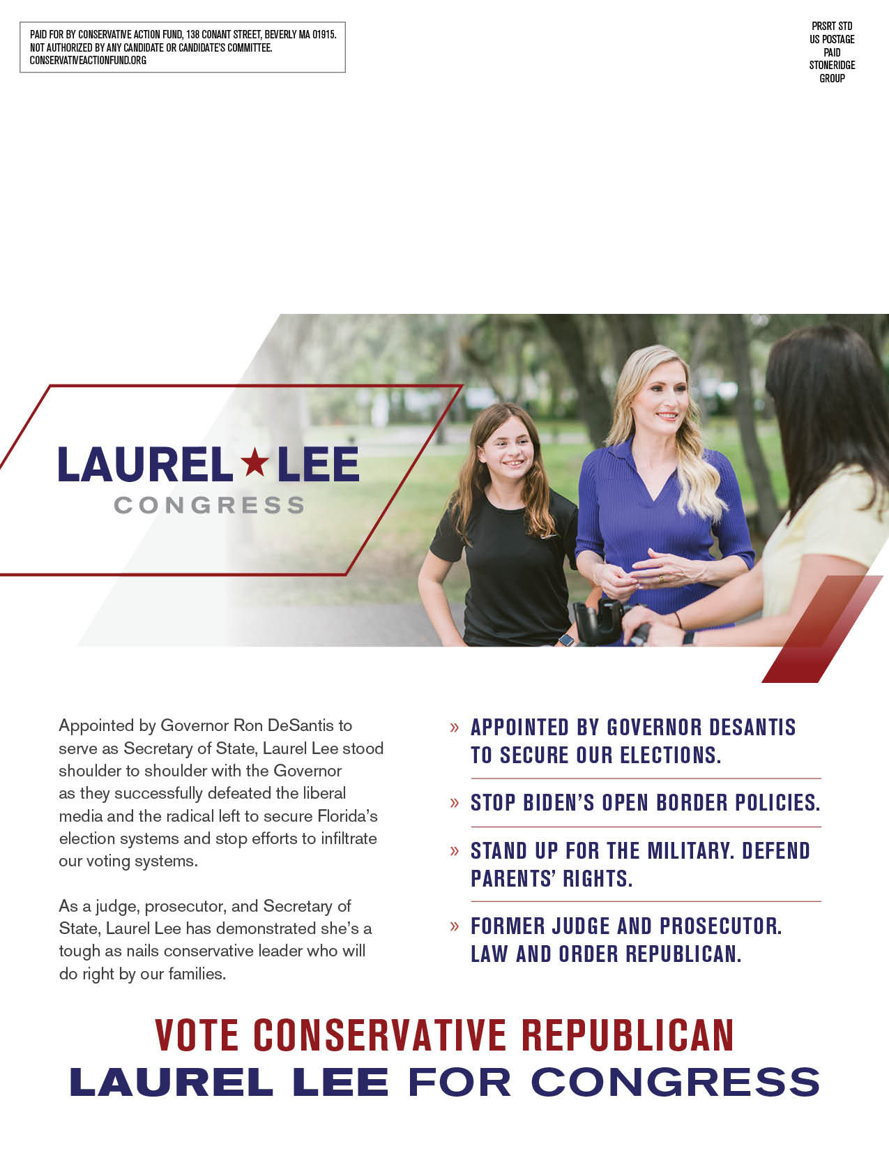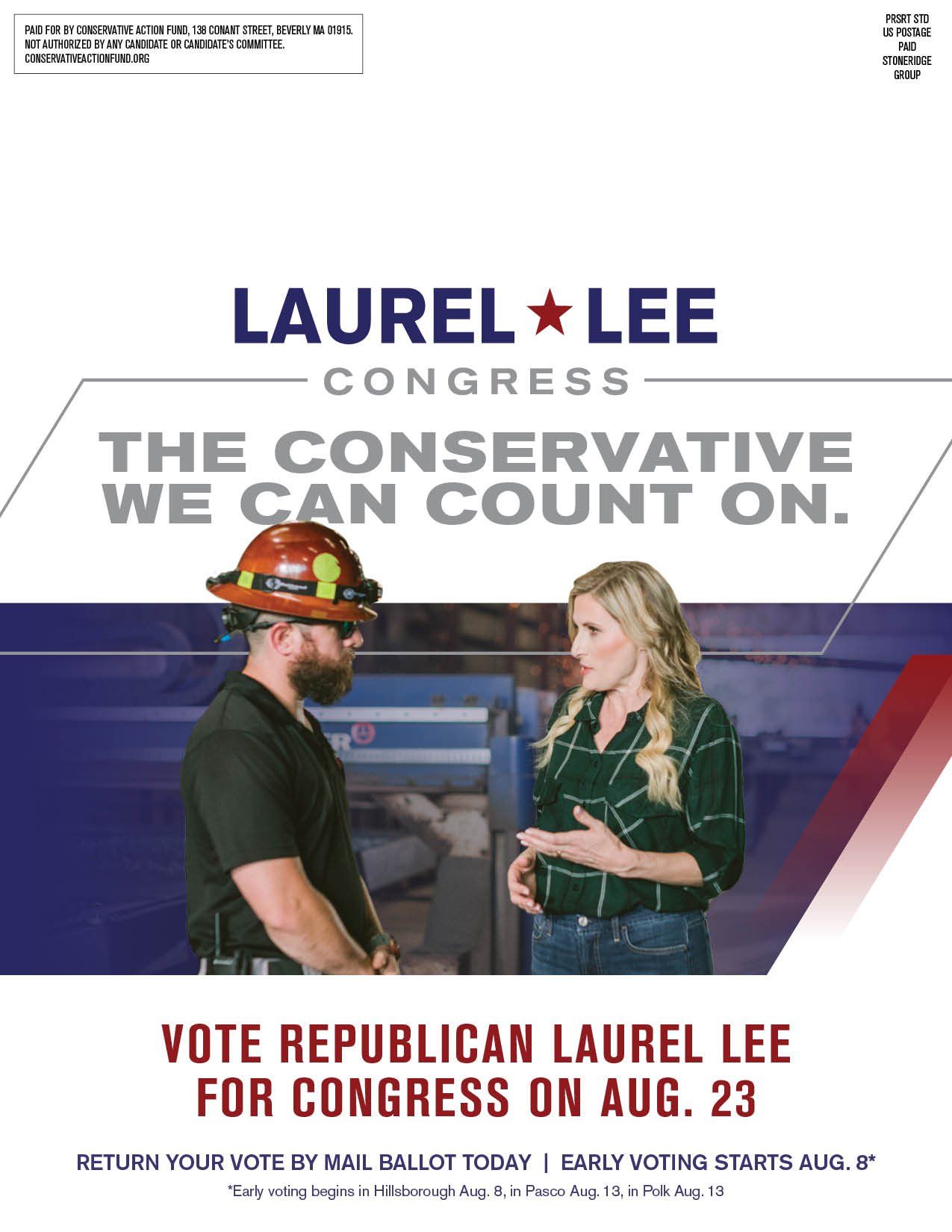 Conservative Action Fund is dedicated to championing the campaign to re-elect conservative Republican Laurel Lee to Congress. With a background as a former Judge and Prosecutor, Laurel Lee was selected by Governor Ron DeSantis to safeguard Florida’s elections as Secretary of State.